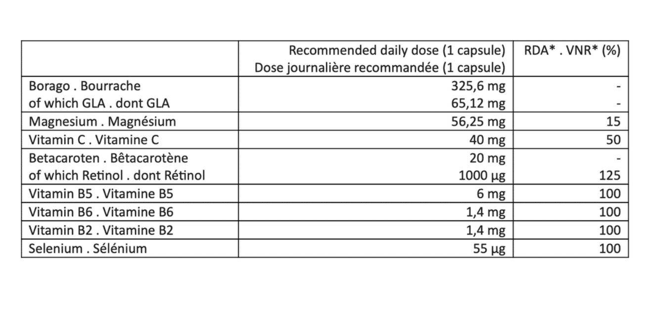 Borago oil, Selenium, Vitamin C, Vitamin B2
