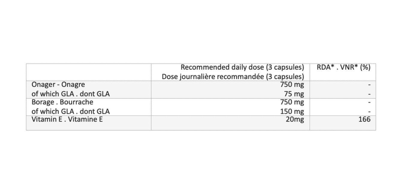 Vitamin E, Onager oil, Borage oil, Bovine gelatin, Glycerin